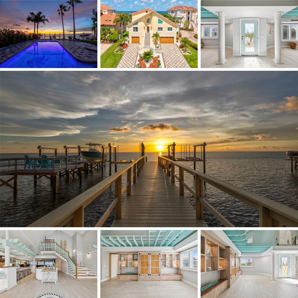 A newly constructed dock anchors the waterfront experience, featuring a 12,000-lb remote-controlled boat lift, dual jet-ski lift, reinforced seawall, and integrated drainage system. The outdoor living space is framed by meticulous landscaping and a resort-style saltwater pool with heating, cooling, and ambient lighting—ideal for both sunset entertaining and morning swims.